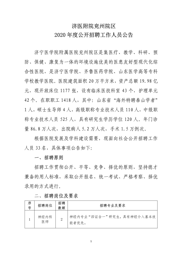 濟(jì)醫(yī)附屬醫(yī)院兗州院區(qū)2020年度公開招聘工作人員公告