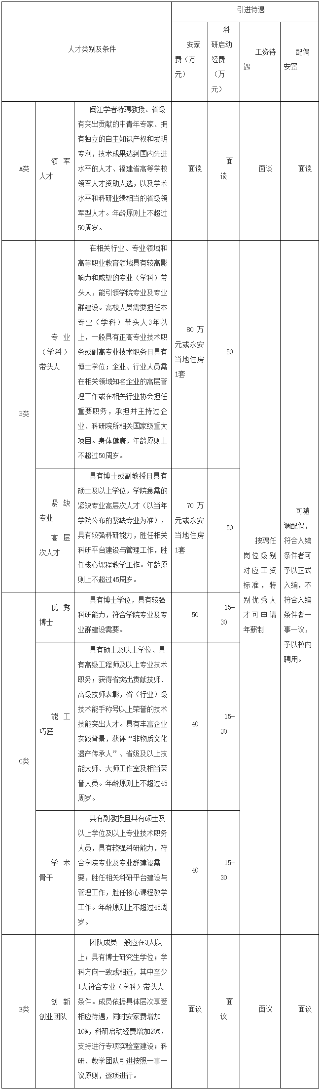引進(jìn)高層次人才由學(xué)院向上級(jí)主管部門申請(qǐng)入編,符合福建省高層次人才相關(guān)政策要求的,可申請(qǐng)相關(guān)人才待遇。高層次人才引進(jìn)待遇按《福建水利電力職業(yè)技術(shù)學(xué)院高層次及緊缺專業(yè)人才引進(jìn)管理辦法(修訂)》執(zhí)行。
