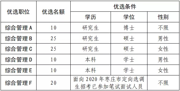 優(yōu)選引進青年人才的范圍為國內(nèi)高校取得全日制研究生學歷、博士學位(以下簡稱博士),取得全日制研究生學歷、碩士學位(以下簡稱碩士)和部分國內(nèi)重點高校取得全日制本科學歷、學士學位(以下簡稱本科生)的人員(高校名單見附件1)。2020年棗莊市計劃優(yōu)選青年人才100名左右,其中,博士10名、碩士50名、本科生20名、2020年棗莊市定向選調生招考已參加筆試面試人員20名,可根據(jù)報名、面試和考察情況,適當增減引進計劃。具體職位如下:
