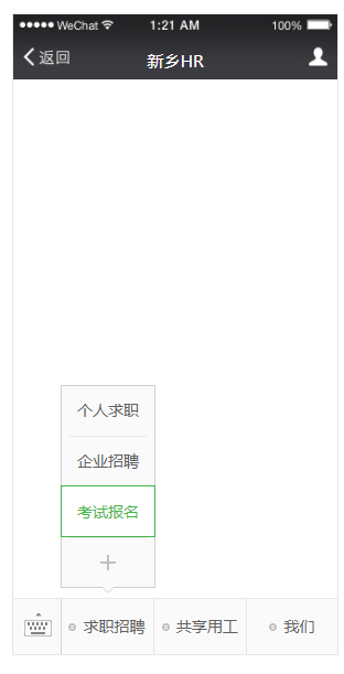 一、在“新鄉(xiāng)HR”公眾號(hào)的首頁(yè)左下角點(diǎn)擊求職招聘,填寫(xiě)“考試報(bào)名”