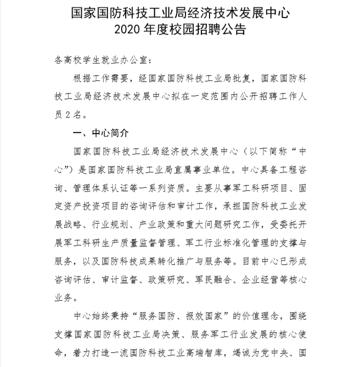 附件1 國防科工局經(jīng)濟(jì)技術(shù)發(fā)展中心2020年開展招聘的公告