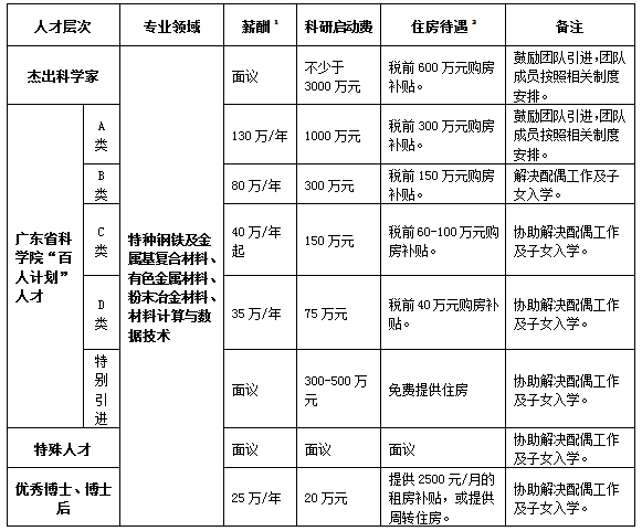 廣東省材料與加工研究所引進(jìn)高層次人才待遇列表