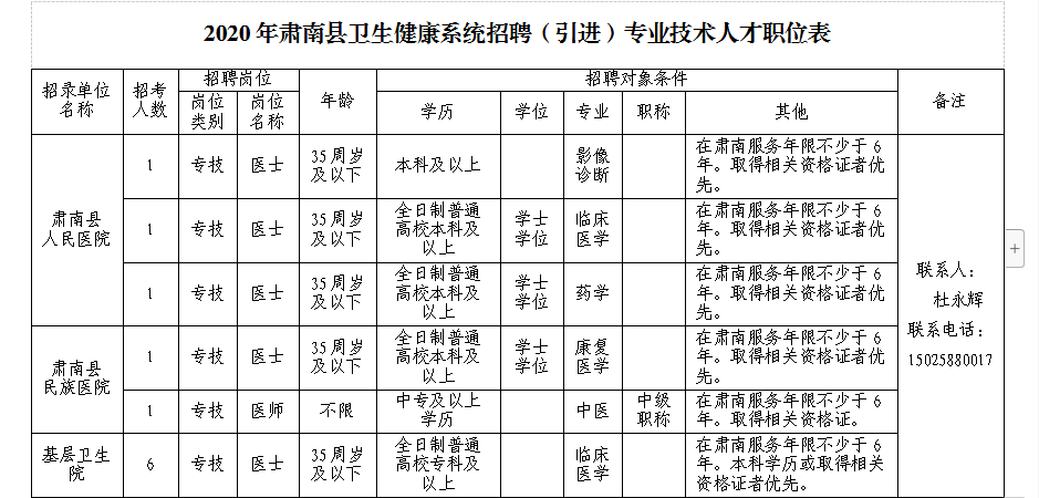 鼓勵肅南縣籍普通高校本科學歷醫(yī)學類專業(yè)技術人員回生源地工作,經(jīng)面試合格者全部安置縣直衛(wèi)生健康事業(yè)單位工作。