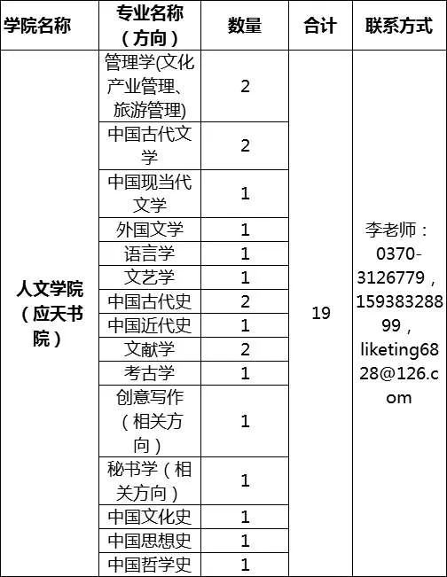 2020年人文學(xué)院(應(yīng)天書院)招聘博士計劃表