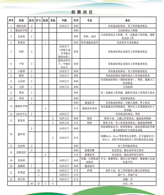 沈北新區(qū)中心醫(yī)院根據(jù)科系發(fā)展及三級(jí)綜合醫(yī)院人才配備標(biāo)準(zhǔn),現(xiàn)公開(kāi)招聘臨床醫(yī)技護(hù)以及非臨床專業(yè)人員共計(jì)90名。