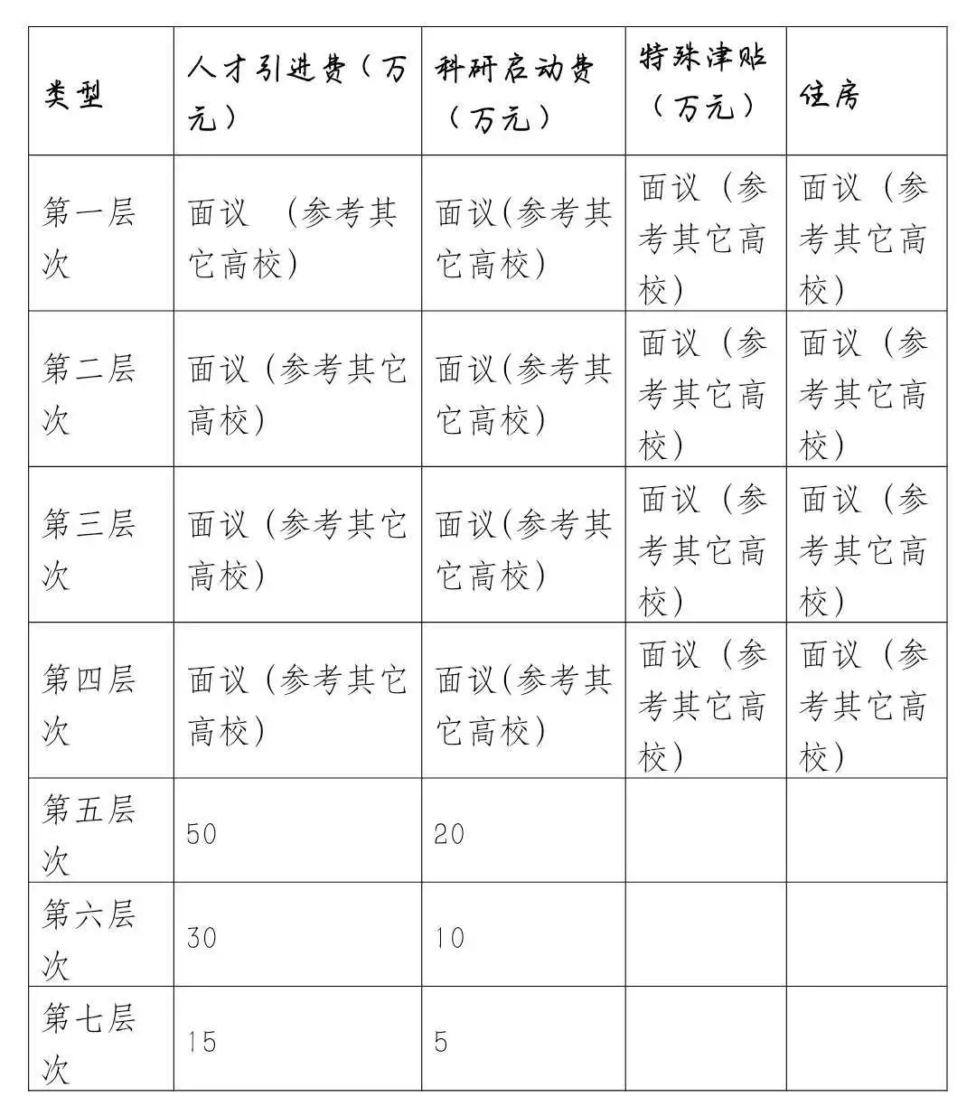 1.學(xué)校提供人才引進(jìn)費、科研啟動費、特殊津貼和住房。第一至第四層次人才引進(jìn)費按照最終簽訂的協(xié)議內(nèi)容支付,其余層次人才引進(jìn)費在被引進(jìn)人才正式入職后一次性支付??蒲袉淤M分三次撥付,特殊津貼按月支付,為第一到四層次人選提供住房。第五到第七層次人選學(xué)校負(fù)責(zé)安排臨時住宿。