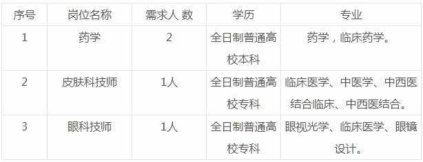 我院因工作需要,現(xiàn)需招聘藥學(xué)、皮膚科技師、眼科技師等崗位編外聘用專(zhuān)業(yè)技術(shù)人員,具體如下: